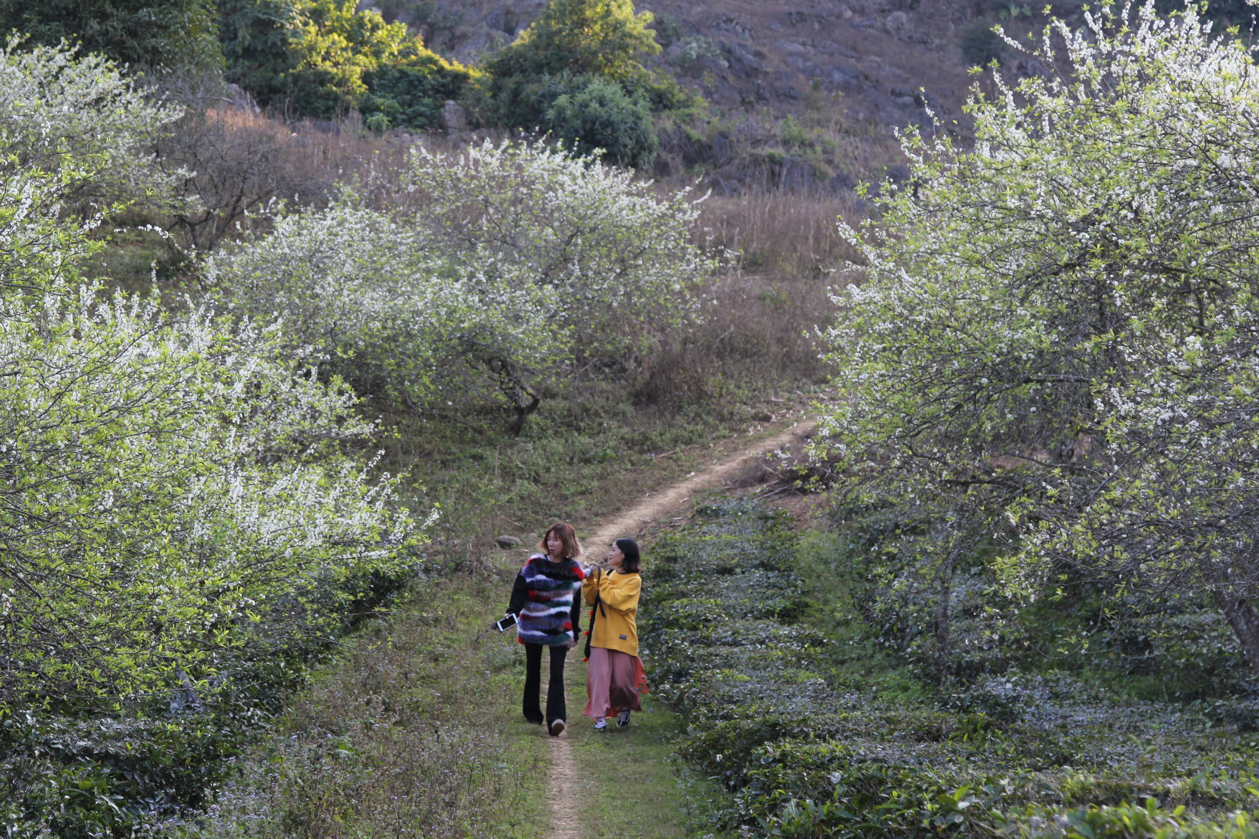 ជាពិសេស ពេលមកទស្សនាស្រុក Moc Chau ក្នុងនិទាឃៈរដូវ អ្នកទេសចរនឹងបានគយគន់ទេសភាពធម្មជាតិដ៏ស្រស់ត្រកាល។ នៅតាមទួលស្រែចំការគឺផ្ការគ្រប់ប្រភេទដូចជាផ្កាម៉ាក់ខៃពណ៌ក្រហម ផ្កាព្រូនពណ៌សរីកស្គុះស្គាយរួមជាមួយពពកគ្របដណ្ដប់លើជ្រលងភ្នំដែលធ្វើឲ្យទឹកដី Moc Chau មានសោភ័ណភាពដ៏ស្រស់ត្រកាល។ អ្នកស្រី Kieu Nhu ជាទេសចរមកពីក្រុងហាណូយបានចែករំលែកថា
