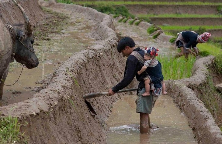 | រដូវទឹកឡើង ឬហៅម្យ៉ាងទៀតថា រដូវភ្ជួរដាស់ គឺជារដូវពិសេសមួយ ពីព្រោះប្រជាជននៅតំបន់ខ្ពង់រាបនេះ ដាំស្រូវតែមួយរដូវក្នុងមួយឆ្នាំប៉ុណ្ណោះ។ (ស្រែកាំជណ្ដើរនៅភូមិ Phung, Hoang Su Phi, Ha Giang។ រូបថត៖ Ky Nam) |