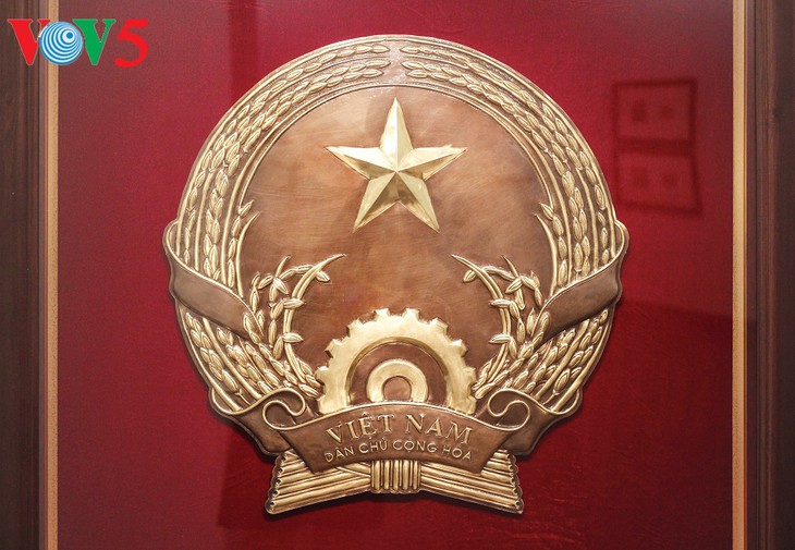 ព្រាងសញ្ញាជាតិវៀតណាមមានពណ៌ ដោយមានរូប ព្រះអាទិត្យរះ ចែងចាំងពន្លឺ ក្រណាត់ចរបាប់ទន់ព័ទ្ធជុំវិញគួស្រូវទុំពណ៌មាស តំណាងឱ្យខឿនឧស្សាហកម្ម ។ |