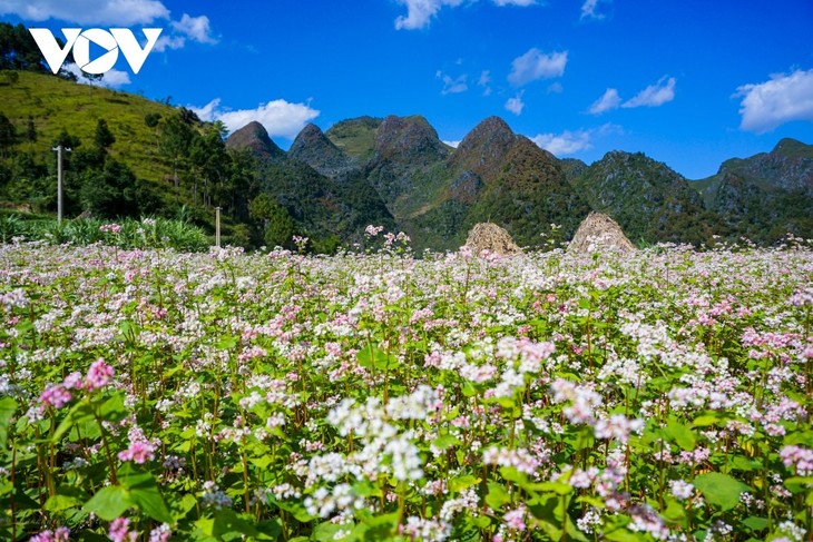 រដូវស្លឹកឈើជ្រុះ តាមផ្លូវទៅកាន់ខ្ពង់រាបថ្ម Dong Van (Ha Giang) ភ្ញៀវទេសចរអាចគយគន់សម្រស់ផ្កា buckwheat នៅគ្រប់ទីកន្លែង។ រូបថត៖ VOV |