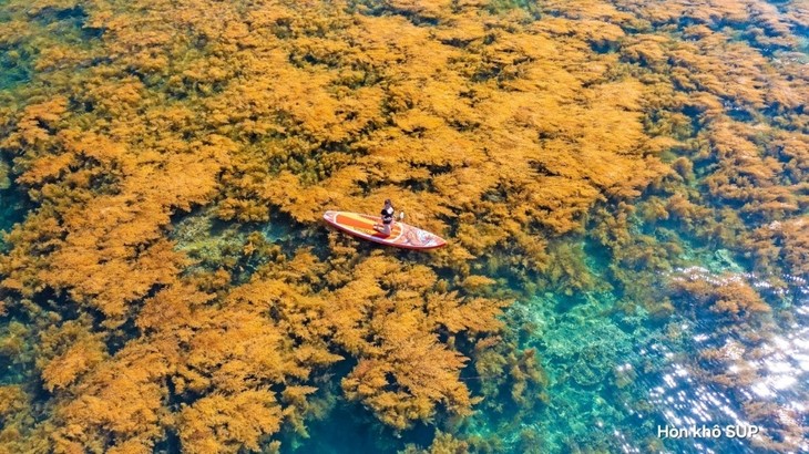 អាចនិយាយបានថា នេះជាពេលវេលាដ៏ស្រស់ស្អាតបំផុតប្រចាំឆ្នាំនៅ Hon Kho ព្រោះនៅពេលដែលជំនោរស្រក សារ៉ាយនិងស្លែចាប់ផ្តើមលេចចេញពីផ្ទៃទឹក ធ្វើឱ្យតំបន់សមុទ្រទាំងមូលប្រែជាពណ៌លឿង។ រូបថត៖ Hon Kho Trip