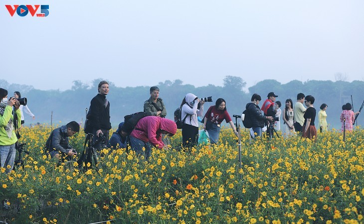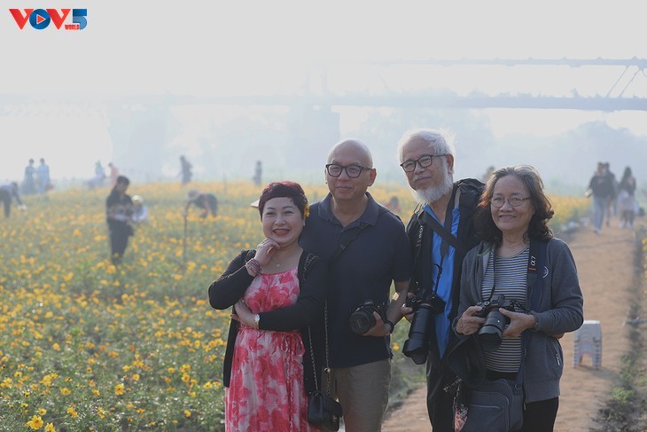 នៅជើងស្ពាន Long Bien ជាប្រវត្តិសាស្ត្រ កំរាលផ្កាដ៏ចម្រុះពណ៌ ទាក់ទាញភ្ញៀវទេសចរណ៍រាប់រយនាក់មកទស្សនា និងថតរូបជារៀងរាល់ថ្ងៃ។