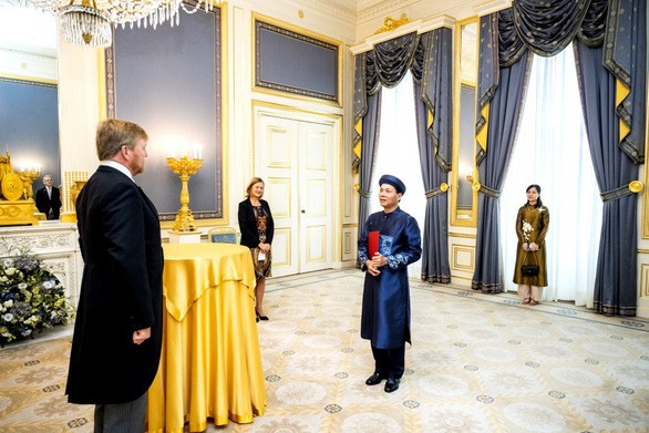 លោកឯកអគ្គរដ្ឋទូតវៀតណាម Pham Viet Anh ស្លៀកពាក់អាវផាយក្នុងឱកាសជូនសារតាំងចំពោះព្រះមហាក្សត្រហូឡង់។