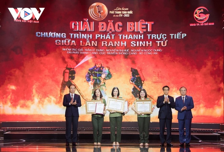 | លេខាគណៈកម្មាធិការបក្សទីក្រុងហូជីមិញលោក Nguyen Van Nen, ឧបនាយករដ្ឋមន្ត្រី លោក Vu Duc Dam, អគ្គនាយកវិទ្យុជាតិវៀតណាម លោក Do Tien Sy បានប្រគល់រង្វាន់ពិសេសសម្រាប់កម្មវិធីវិទ្យុផ្សាយផ្ទាល់ “នៅចំកណ្តាលបន្ទាត់រវាងអាយុជីវិតនិងសេចក្តីស្លាប់” របស់ក្រុមអ្នកនិពន្ធ Tran Le Dung, Nguyen Thi Hue, Nguyen Ngoc Dung (វិទ្យុនគរបាលប្រជាជន)។ នេះជារង្វាន់ពិសេសដំបូងគេដែលទទួលបាននៅមហោស្រពផ្សាយសម្លេងជាតិ។ |