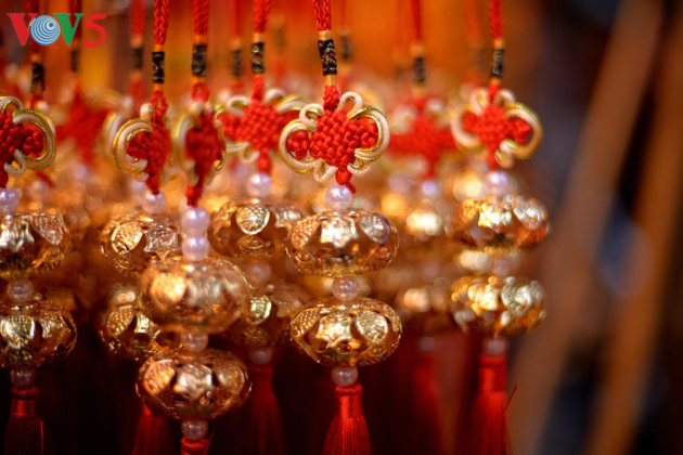 | នៅតំបន់វិថីបុរាណដូចជា Hang Ma, Dong Xuan , Hang Luoc គឺពោរពេញ ដោយស្តង់លក់ទំនិញសម្រាប់លំអរក្នុងបុណ្យតេត។ |