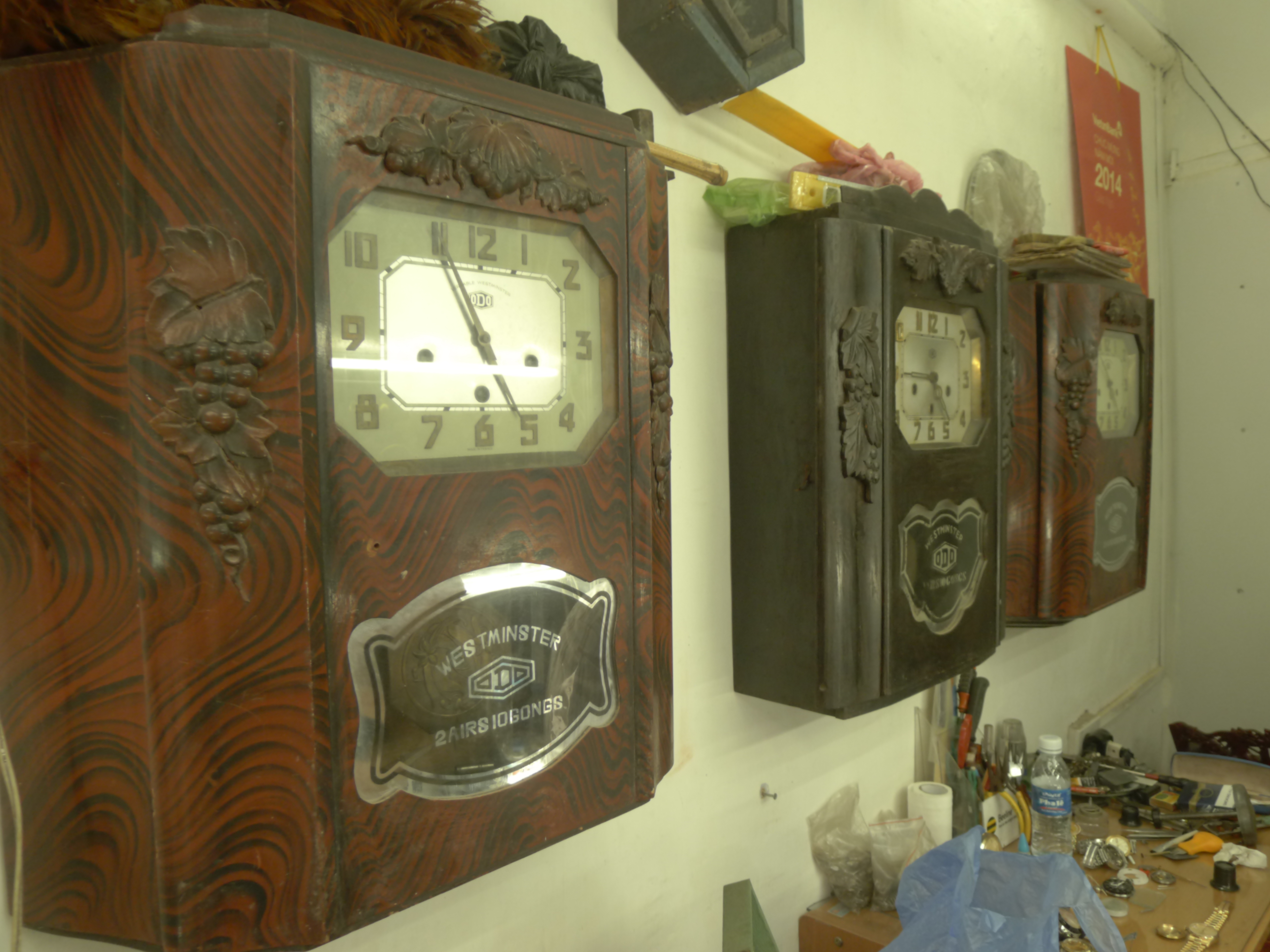 (VOVworld) - នាឡិកាព្យួរជញ្ជាំង។ នាឡិកាដាក់បង្ហាញជាប់ៗគ្នាក្នុងទូកញ្ចក់។ នាឡិកាលើដំបូលទូក្នុងហាងមួយរបស់លោក Tran Ngoc Dinh ដែលមានផ្ទៃដីត្រឹម