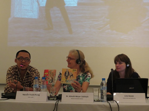 | បណ្ឌិត Almuth Meyer Zollitsch ប្រធានវិទ្យាស្ថាន Goethe ទីក្រុងហាណូយ វិចិត្រករ Nguyen Thanh Phong និងLine Hoven វិចិត្រការិនី (songtre.tv) |