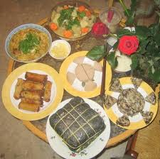 នុំអន្សមជាដើម។ ផ្ទះនីមួយៗបានរៀបចំនិងតុបតែងដោយដើមមា់ខៃ ពាក្សប្រដូច សំដៅសម្តែងរាល់បំណងប្រាថ្នារបស់ខ្លួនក្នុងឆ្នាំថ្មី។ នៅតាមផ្ទះនៃគញរួសារនិមួយៗ បានរៀបចំស្ពកដាក់សែនទេវតា រួមមានបាយដណើប មាន់ស្ងោ ស្រាស នំអន្សម។ ស្តីអំពីទំនៀមទម្លាប់ទទួលទេវតាឆ្នាំថ្មី លោកតា Nguyen Xuan Dao នៅស្រុក