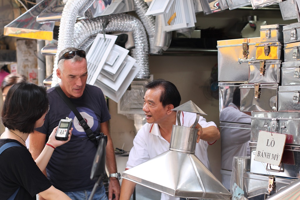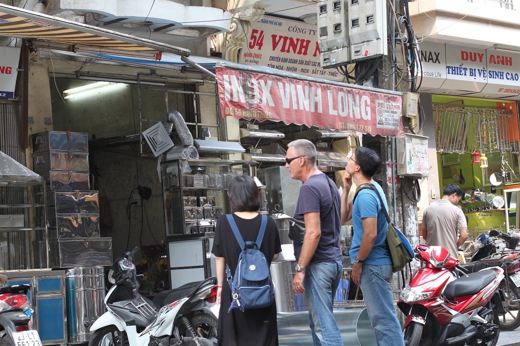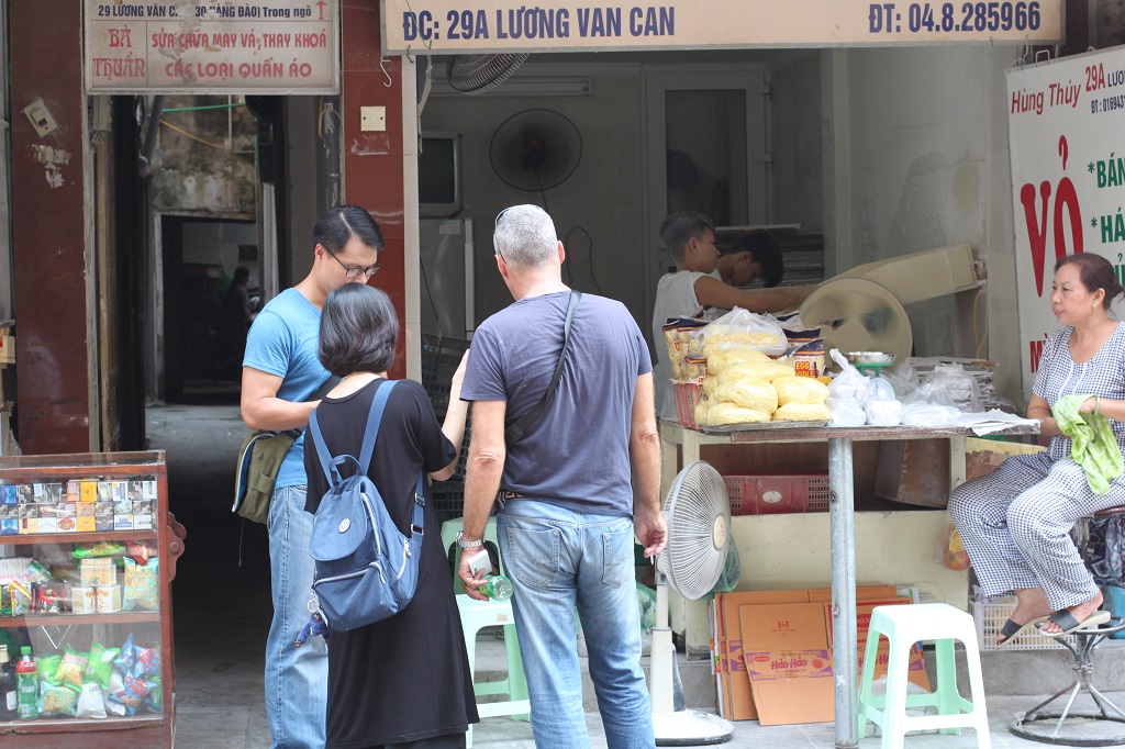 | Quan និងលោក David ឈប់នៅខាងមុខហាងលេខ ៤៨ លើវិថី Hang Thiec (VOVWorld) |