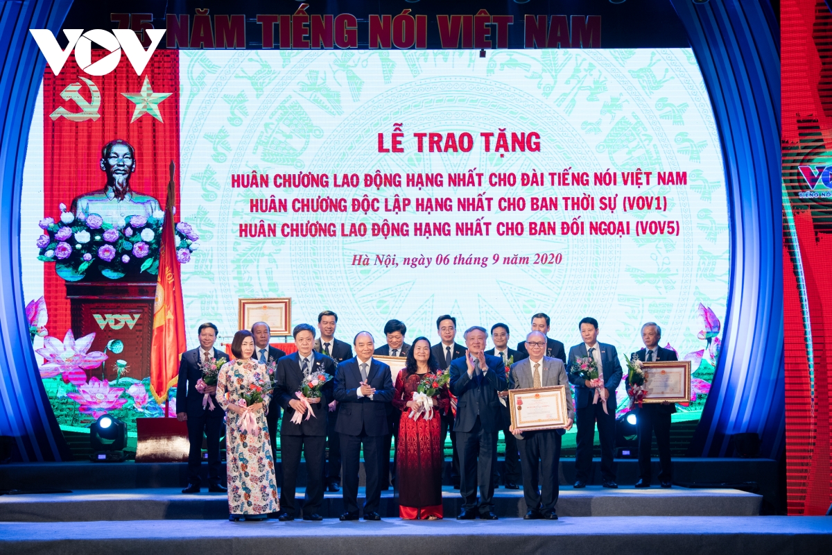 លោកនាយករដ្ឋមន្រ្តី Nguyen Xuan Phuc អញ្ជើញប្រគល់គ្រឿងឥស្សរិយយសពលកម្មថ្នាក់ទី១ជូនចំពោះគណៈកម្មាធិការទទួលបន្ទុកការផ្សាយជាភាសាបរទេស (VOV5) នៅពិធីរំលឹកខួបលើកទី៧៥ទិវាបង្កើតវិទ្យុសម្លេងវៀតណាមនៅថ្ងៃទី៦កញ្ញា។ (រូបថត៖ VOV) |