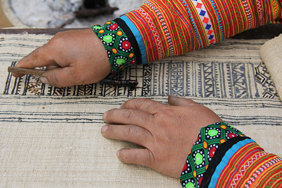 សម្លៀកបំពាក់របស់ជានជាតិ Mong ទាក់ទាញភ្នែក មិនត្រឹមតែដោយសារភាពចម្លែកនិងពណ៌ចាប់ភ្នែកប៉ុណ្ណោះទេ ប៉ុន្តែថែមទាំងដោយក្បូរក្បាច់រចនា ជាពិសេសក្បូរក្បាច់ដោយក្រមួនឃ្មុំ។ ដំណាក់កាលចម្បងដើម្បីបង្កើតក្បូរក្បាច់ស្អាតបែបនេះគឺការគូក្រមួន។ នៅពេលគូរ សិប្បករនឹងចុចស្លាបប៉ាក់កាចូលទៅក្នុងក្រមួនឃ្មុំដែលត្រូវបានរំលាយហើយ។ គូរួចហើយ ចាក់ក្រណាត់ទៅក្នុងឆ្នាំងទឹកពុះ ដើម្បីឱ្យក្រមួនឃ្មុំរលាយចូលគ្នាទាំងអស់ ហើយបន្សល់ទុកនូវក្បូរក្បាច់ដ៏ស្រស់ស្អាតនៅលើក្រណាត់។
