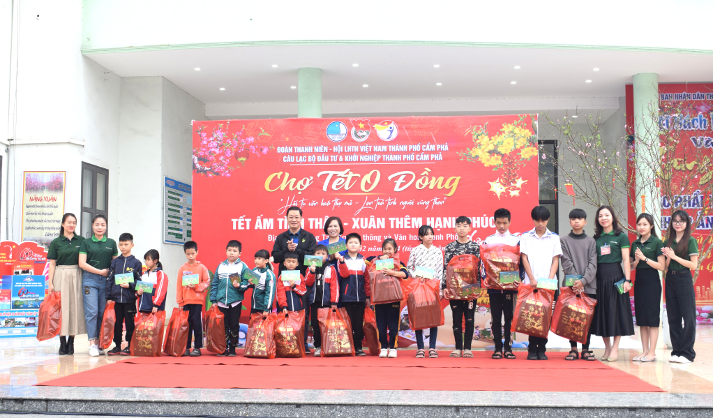 សិស្សានុសិស្សនិងកុមារក្រីក្រទទួលបានអំណោយតេតក្នុងក្របខ័ណ្ឌកម្មវិធី ផ្សារតេត ០ ដុង នៅទីក្រុង Cam Pha ខេត្ត Quang Ninh។