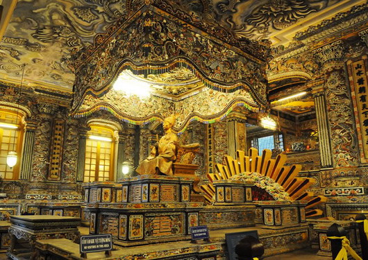 | បដិមាធ្វើអំពីសំរិទ្ធរបស់ព្រះមហាក្សត្រ Khai Dinh ស្ថិតនៅលើផ្នូរបញ្ចុះសពនៅក្នុងល្វែងកណ្ដាលនៃវិមាន Thien Dinh |