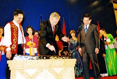 | អតីតប្រធានាធិបតីអាមេរិក Bushដេញចាប៉ីសាយដៀវក្នុង ឱកាសកិច្ចប្រជុំ APEC នៅទីក្រុងហាណូយនាឆ្នាំ ២០០៦ (រូបថតៈ Internet) |