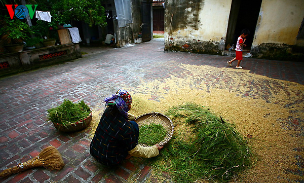 | ហាលស្រូវក្នុងថូធ្លាផ្ទះ។ |