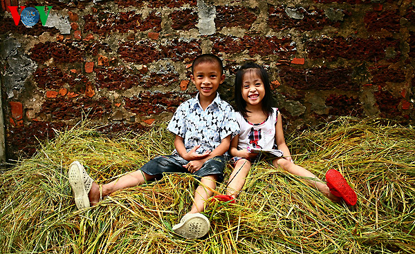 | ហាលស្រូវនៅទីលានសាលាភូមិ។ កុមារាកុមារីលែងកំសានផងមើលស្រូវជួយឪពុកម្តាយផង។ |