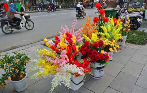 | ផ្កាក្លែងក្លាយក៏ជាមុខទំនិញមិនអាចខ្វះបានឡើយចំពោះមនុស្សម្នាជាច្រើនក្នុងពិធីបុណ្យតេត។ |