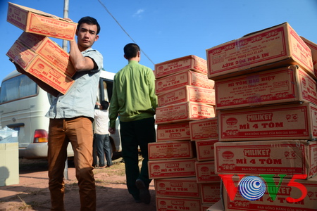 | បណ្ដាចំណែកអំណោយជាសមភារៈចាំបាច់ ស្បៀងអាហារ មីកញ្ចប់ ភួយនិងអាវ |