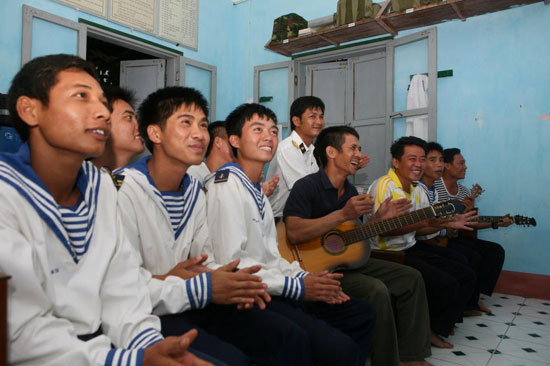 | ក្រុមសិល្បករនៅកោះ Truong Sa ធំ។ នេះគឺជាអ្នកចម្រៀងពូកែបំផុតនៅទីនេះ។ |