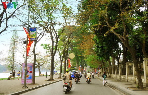 ព័ណ៍ខៀវខ្ចីនៃស្លឹកឈើទាំងនោះបានធ្វើឲ្យទិដ្ឋភាពទីក្រុងហាណូយកាន់តែស្រស់ ស្អាតរ៉ូម៉ង់ទិចជាងរៀត។