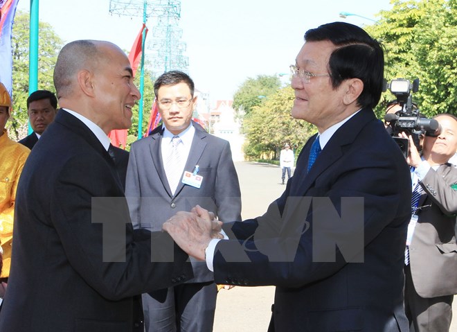 1. ព្រះមហាក្សត្រកម្ពុជា ព្រះករុណាព្រះបាតសម្តេចព្រះបរមនាថ នរោត្តម សីហមុនី ទទួលជួបសន្ទនាជាមួយប្រធានរដ្ឋ វៀតណាម លោក Truong Tan Sang ក្នុងដំណើរទស្សនកិច្ចជាផ្លូវការនៅព្រះរាជាណាចក្រកម្ពុជា ចាប់ពីថ្ងៃទី ២៣ ដល់ទី ២៤ ធ្នូរ ឆ្នាំ ២០១៤។ (Image: Nguyen Khang/Vietnam+)