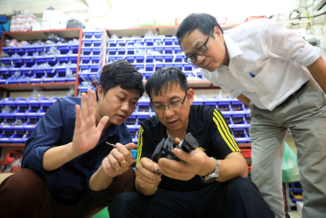លោក Luu Duc My (ខាងឆ្វេង) និងឪពុកកំពុងត្រួតពិនិត្យកូនសោប្រភេទថ្មី (រូបថត៖ Thanhnien.vn)