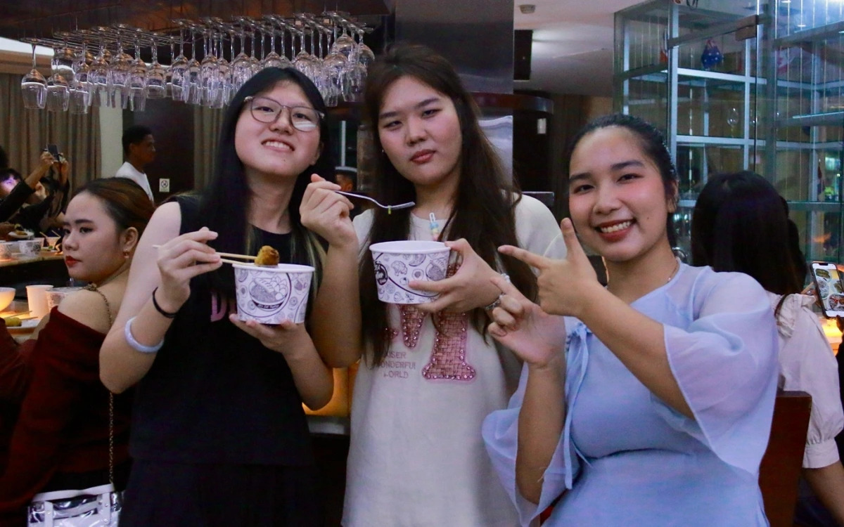 និស្សិទឥណ្ឌូណេស៊ីរីករាយនឹងម្ហូបហ្វើវៀតណាម ដែលណែនាំដោយ Bao Ngoc (ខាងស្តាំ) បានឧទ្ទេសនាម។ |