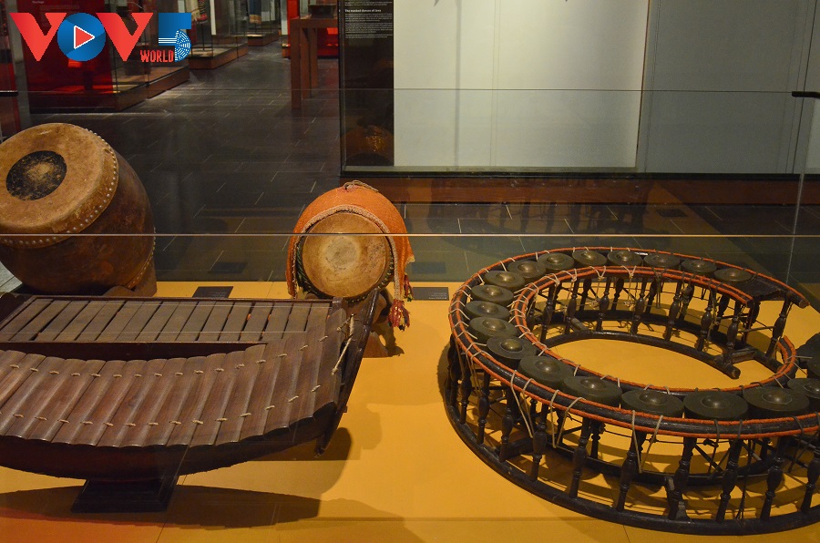ឧបករណ៍តន្ត្រីខ្មែរត្រូវបានដាក់តាំងបង្ហាញនៅក្នុងសារមន្ទីរ។ |
