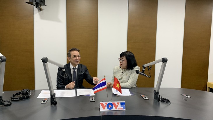 លោក Nikorndej Balankura ឯកអគ្គរាជទូតវិសាមញ្ញនិងពេញសមត្ថភាពនៃព្រះរាជាណាចក្រថៃប្រចាំនៅវៀតណាមឆ្លើយសម្ភាសន៍ជាមួយអ្នកសារព័ត៌មាននៃវិទ្យុសំឡេងវៀតណាម។ (រូបថត៖ VOV5)