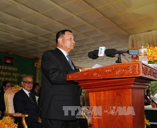ប្រធានព្រឹទ្ធសភានៃព្រះរាជាណាចក្រកម្ពុជា សម្តេចវិបុលសេនាភក្តី សាយ ឈុំ អញ្ជើញថ្លែងនៅពិធីសម្ពោធវិមានមិត្តភាពកម្ពុជា-វៀតណាម។ (រូបថត៖ VNA) |