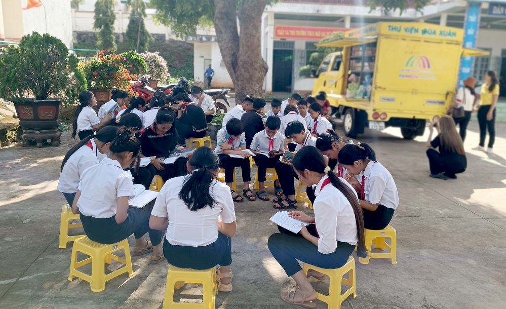 នៅក្រោមម្លប់ដើមឈើបៃតងនៅក្នុងបរិវេណអនុវិទ្យាល័យ To Vinh Dien ទីរួមខេត្ត Buon Ho ខេត្ត Dak Lak សិស្សមួយក្រុម កំពុងអង្គុយអានសៀវភៅយ៉ាងយកចិត្តទុកដាក់នៅក្បែររថយន្តដឹកទំនិញពណ៌លឿងដែលមានឈ្មោះថា "បណ្ណាល័យនិទាឃរដូវ"។