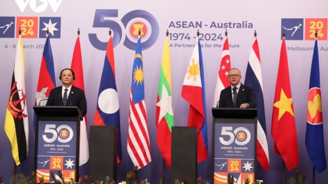 (VOVWORLD) - 3월 6일 오후 (현지 시간) 호주 멜버른에서 아세안-호주 수교 50주년 특별 고위급 회의가 폐막했다. 회의 폐막식 후 앤서니 앨버니지(Anthony Albanese) 호주 총리와 쏜싸이 시판돈(Sonexay Siphandone) 라오스 총리는 회의 결과에 대한 기자회견을 공동 주재했다.