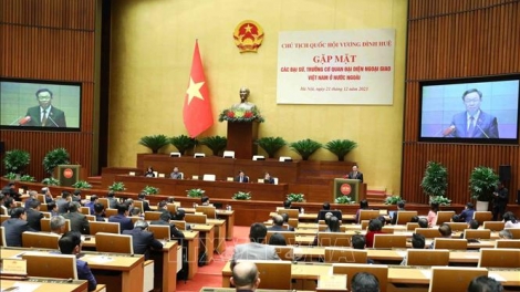 (VOVWORLD) - 제32차 외교 회의의 일환으로 12월 21일 오후 국회청사에서 브엉 딘 후에 국회의장은 부이 타인 선(Bùi Thanh Sơn) 외교부 장관이 이끈 해외 베트남 대사‧대표단장 대표단을 접견했다.