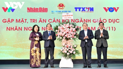 (VOVWORLD) - 베트남 스승의 날 41주년을 맞아 17일 오후 하노이에서 베트남의 소리 라디오 방송국(VOV), 인민신문, 베트남 통신사, 베트남 텔레비전 방송국(VTV) 등 네 개의 언론기관은 교육훈련부와 협력해 교육계 현직 간부 만남 프로그램을 공동 개최했다.