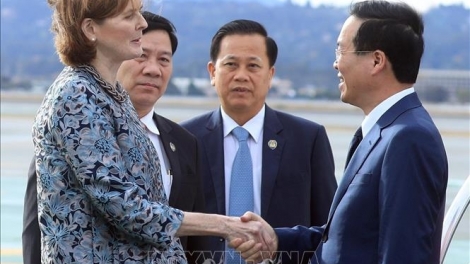 (VOVWORLD) - 11월 14일 오전(현지 시간) 보 반 트엉 주석, 영부인과 베트남 고위급 대표단이 미국 샌프란시스코 국제공항에 도착했다. 이번 방문은 조 바이든(Joe Biden) 미국 대통령의 초청으로 이뤄졌으며, 아시아‧태평양경제협력체(APEC, 에이펙) 정상회의 참석을 위한 미국 방문이다.