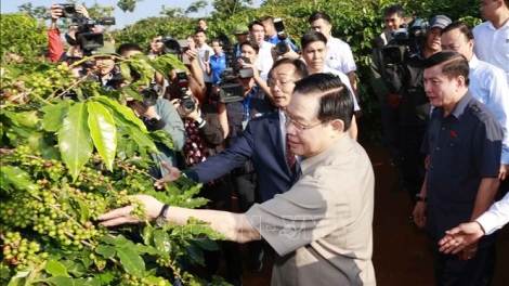 (VOVWORLD) - 선라성을 방문 중인 브엉 딘 후에 국회의장은 10월 21일 오전 마이선(Mai Sơn)현 므엉본(Mường Bon)면에 위치한 선라 커피 재배지 주민과 만났고, 선라 커피 가공 공장 준공식에 참석했다.
