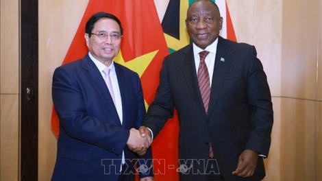 (VOVWORLD) - 주요 20개국(G20) 정상회의 참석 및 남아프리카공화국(남아공) 공식 방문의 일환으로 11월 21일 오후 요하네스버그(Johannesburg)에서 팜 민 찐 총리와 시릴 라마포사(Cyril Ramaphosa) 남아공 대통령은 베트남과 남아공 간의 관계를 ‘전략적 동반자 관계’로 격상하기로 공식 선언했다.
