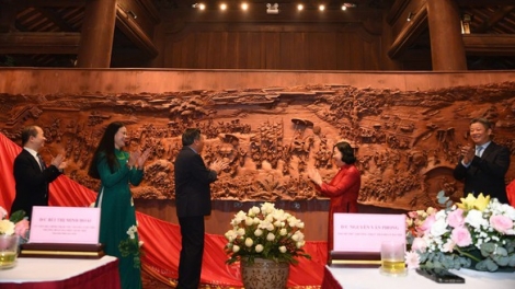 (VOVWORLD) - 하노이 수도 해방 71주년을 기념해 10월 10일 오전에 문묘-국자감 문화 과학 활동 센터는 하노이시가 기증한 매우 독창적인 대형 목판화 작품 ‘금의환향’을 인수받았다.