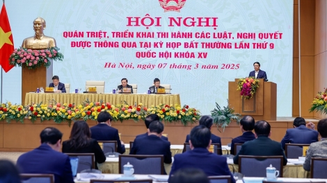 (VOVWORLD) - 3월 7일 오후 팜 민 찐 총리는 최근 15대 국회 제9차 임시회의에서 통과된 일부 법안, 결의안 이행에 관한 회의를 주재했다. 해당 회의는 베트남 정부 청사와 63개 중앙 직할 성시를 온라인으로 연결하여 개최되었다.