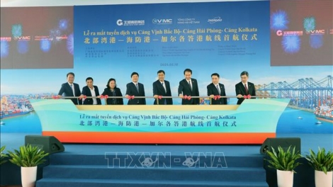 (VOVWORLD) - 2월 18일 하이퐁 항만 주식회사 떤부(Tân Vũ) 항구 지점에서 베트남 해양 공사(VIMC)는 중국 광시 통킹만 국제항만 그룹, 중국 컨테이너선사 종구시핑(Zhonggu Shipping)과 협력하여 통킹만-하이퐁-콜카타를 잇는 컨테이너 노선을 선보였다. 이는 베트남 북부 지방 하이퐁 항만과 통킹만 항만을 연결하는 첫 컨테이너선이다.