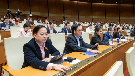 (VOVWORLD) - 15기 국회 제9차 부정기 회의를 지속 진행하여 2월 18일 하노이에서 국회대표들은 15기 국회 임기 정부 구조에 관한 2025년 15기 국회 제176호 결의(176/2025/QH15호)와 15기 국회 임기 정부 인원수 구조에 관한 2025년 15기 국회 제177호 결의(177/2025/QH15호)를 통과시켰다.