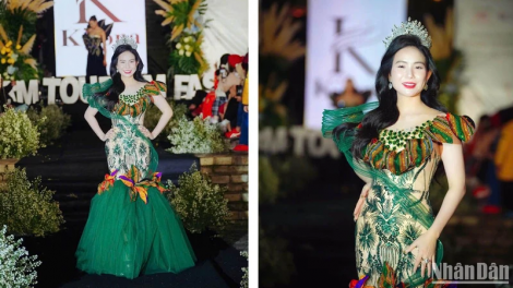 (VOVWORLD) - 2024년 제10회 달랏 꽃 페스티벌의 일환으로 달랏시 달랏 팰리스 호텔(Dalat Palace Hotel)에서 케이 조나(K’Jona) 디자이너와 흥 까오(Hưng Cao) 디자이너는 ‘토껌(thổ cẩm, 브로케이드)의 다채로운 꽃 정원’이라는 패션 컬렉션을 선보였다.