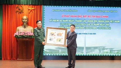 (VOVWORLD) - 12월 18일 하노이에서 베트남 정보통신부는 베트남 인민군 정치총국, 베트남 우정공사와 협력해 베트남 인민군 설립 80주년 및 전 국민 국방의 날 35주년을 맞아 특별 우표 세트를 출시했다.