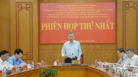 (VOVWORLD) - 11월 19일 오전 하노이 당 중앙 청사에서 또 럼 당 서기장은 간소하고 효과적인 정치 시스템 구조조정 및 개혁에 대한 12기 당 중앙 집행위원회의 제18호 결의 이행에 대한 중앙 지도부(이하 지도부)의 제1차 회의를 지도부 부장으로서 주재했다.