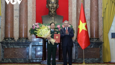 (VOVWORLD) - 10월 20일 오후 주석궁에서 또 럼 당서기장 겸 국가주석은 당 중앙 군사 위원회 위원장이자 국방안보 위원회 위원장, 무장역량 통령으로서 베트남 인민군과 인민 공안 일부 지도자에 대한 승격 결정 전달식을 주재했다.