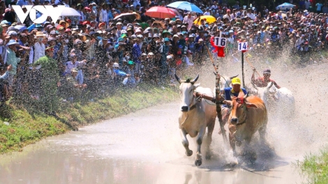 (VOVWORLD) - 9월 29일 2024년 제29회 안장성 텔레비전 방송국배 바이누이(Bảy Núi) 지역 소 경주 대회가 안장성 띤비엔(Tịnh Biên)읍 소 경주 경기장에서 개최됐다. 올해 행사에는 크메르족 거주 지역에서 온 128 마리의 소들이 참가했다.