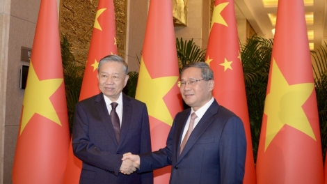(VOVWORLD) - 중국 국빈 방문의 일환으로 8월 19일 베이징 댜오위타이 국빈관에서 또 럼 서기장‧주석은 리창 중국 국무원 총리와 회견했다.