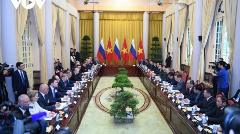 (VOVWORLD) - 6월 20일 정오 주석궁에서 열린 환영식 직후 또 럼 주석과 블라디미르 푸틴(Vladimir Putin) 러시아 대통령은 양국 여러 고위급 지도자의 참석과 함께 정상회담을 진행했다. 또 럼 주석이 베트남 국가주석으로 선출된 후 푸틴 대통령과 회담하는 것은 이번이 처음이다.