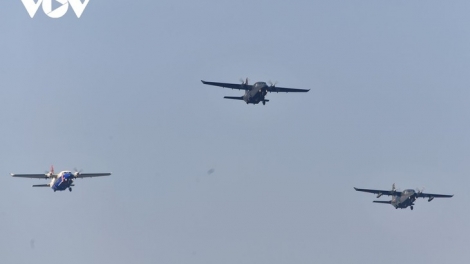(VOVWORLD) - 베트남 공군 918 비행여단 소속 수송기 편대가 하노이 자럼(Gia Lâm) 공항에서 베트남 8월 혁명 성공 및 9월 2일 독립 80주년 기념식에서 비행 임무 수행을 위한 대형 비행 훈련에 돌입했다.