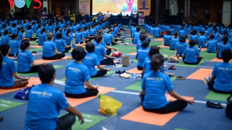 (VOVWORLD) - 6월 16일 하노이 육상 체육관에서 6월 21일 국제요가의 날을 기념하는 일련의 행사에 대한 개막식이 독특한 공동 요가 퍼포먼스 행사로 열렸다.